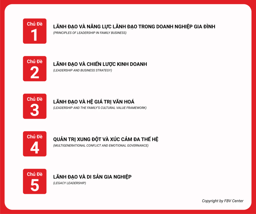 “Doanh nghiệp gia đình được lãnh đạo bằng lý trí, nhưng bền vững nhờ trái tim”.  Câu phát biểu này chỉ ra tính độc đáo về lãnh đạo hướng đến bền vững bằng trái tim, đó là tinh thần cốt lõi về lãnh đạo trong DNGĐ. Do đó, khóa học này giới thiệu về các khái niệm và nguyên tắc quan trọng trong việc lãnh đạo doanh nghiệp gia đình. Nội dung khóa học bao gồm những đặc thù của lãnh đạo trong doanh nghiệp do gia đình sở hữu, tầm quan trọng của việc kết hợp quản trị gia đình và doanh nghiệp, cũng như các nguyên tắc quản trị phù hợp với mô hình doanh nghiệp gia đình. Bên cạnh đó, học viên sẽ tìm hiểu về cách phát triển thế hệ kế thừa, các mô hình lãnh đạo đặc trưng, và cách lãnh đạo xây dựng chiến lược bền vững qua nhiều thế hệ từ những tình huống điển cứu..