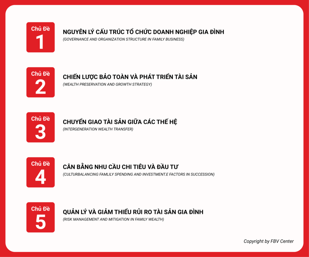 Theo James E. Hughes Jr-Tác giả cuốn sách Family wealth: Keeping it in the family, “Thất bại trong quản lý tài sản không đến từ sai lầm trong quản lý tài chính, mà đến từ thiếu tầm nhìn, giao tiếp và quy trình chuyển giao thế hệ”. Thêm nữa, Dennis Jaffe (Wealth 3.0) cho rằng “Quản lý tài sản không chỉ là tiền-mà là quản lý bản sắc, quyền lực, mục đích và kế nghiệp”. Do đó, khóa học này giới thiệu bản chất về quản trị tài sản/sản nghiệp gia đình, bảo toàn và phát triển tài sản, chuyển giao tài sản giữa các thế hệ, cân bằng chi tiêu và đầu tư, quản lý rủi ro cùng các chiến lược phát triển di sản và lãnh đạo trong môi trường doanh nghiệp gia đình.
