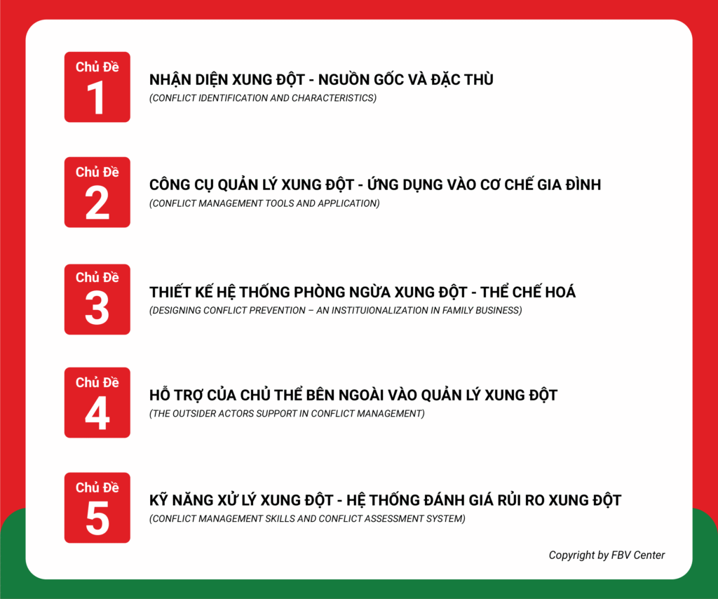 Xung đột là “nguồn cơn” thường chỉ được nhìn nhận khi hậu quả của xung đột đã đến “điểm nóng” trong công ty gia đình. Nguồn cơn của xung đột cần phải được chủ động phòng ngừa trong quá trình phát triển doanh nghiệp gia đình. Trong đó, các loại xung đột về phân vai bị chồng lấn, khác biệt về kỳ vọng thế hệ, quyền sở hữu-điều hành, thiếu minh bạch và cảm xúc/quan hệ cá nhân…nên được quản trị hiệu quả. Hậu quả xung đột có thể “phá bỏ” tất cả “tiền đồ” đã gầy dựng gia nghiệp của nhiều thế hệ. Khoá học Quản lý xung đột trong doanh nghiệp gia đình (Conflict Management in Family Business) là chương trình được thiết kế dành riêng cho các thành viên trong gia đình tham gia quản lý, điều hành hoặc sở hữu doanh nghiệp. Khoá học là “bộ khung” hướng dẫn từ nhận diện xung đột-ứng dụng công cụ quản lý xung đột-thiết kế cơ chế phòng ngừa – phát triển kỹ năng cá nhân trong quản lý xung đột.